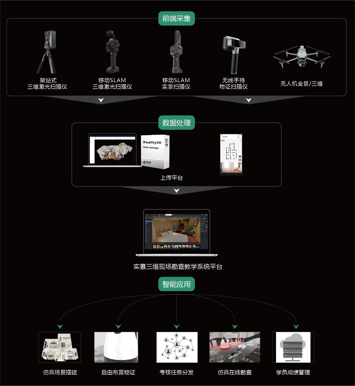 前端采集:配备适合不同教学场景的三维重建设备,安全、快速、方便地将现场准确地记录固定。