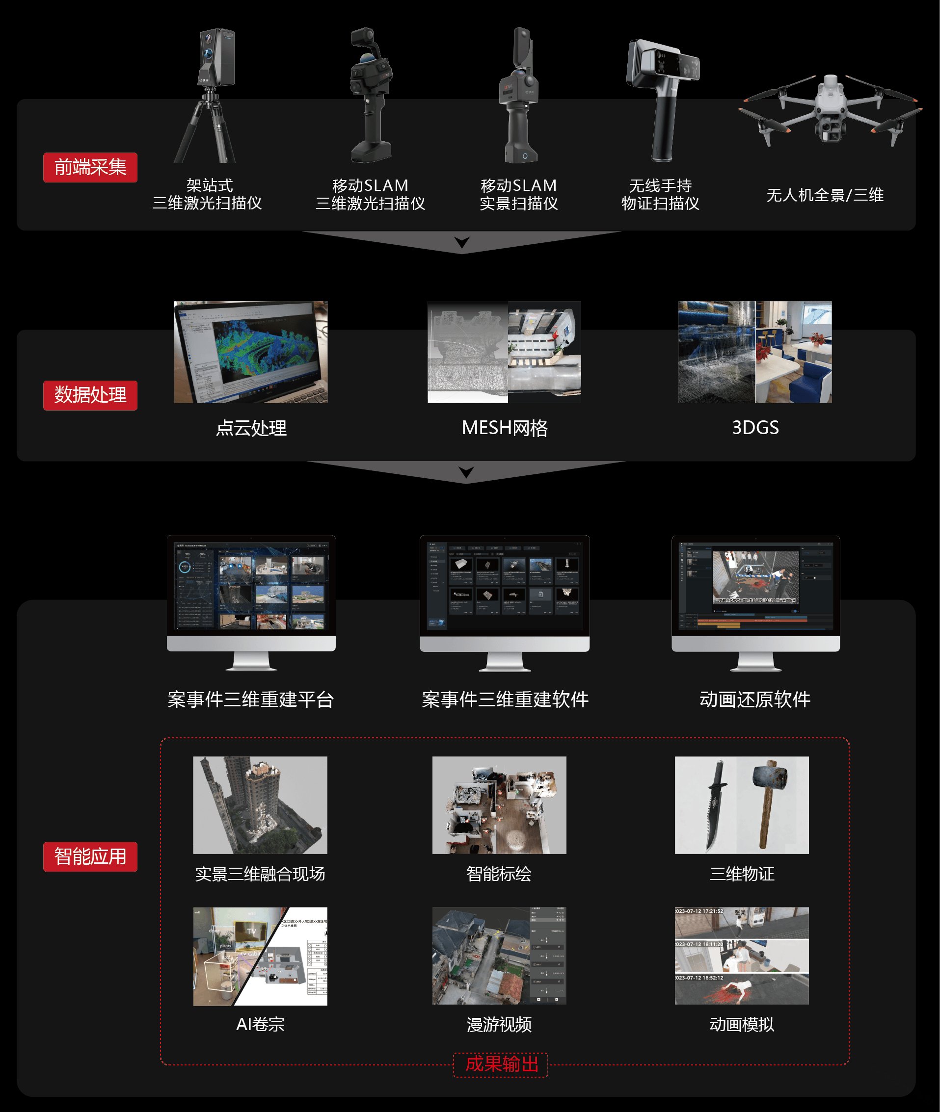 智能应用:多源数据统一接入“臻3D软件/平台”,多元数据融合展示、三维物证、AI三录材料、漫游视频、案件还原动画等业务成果输出。