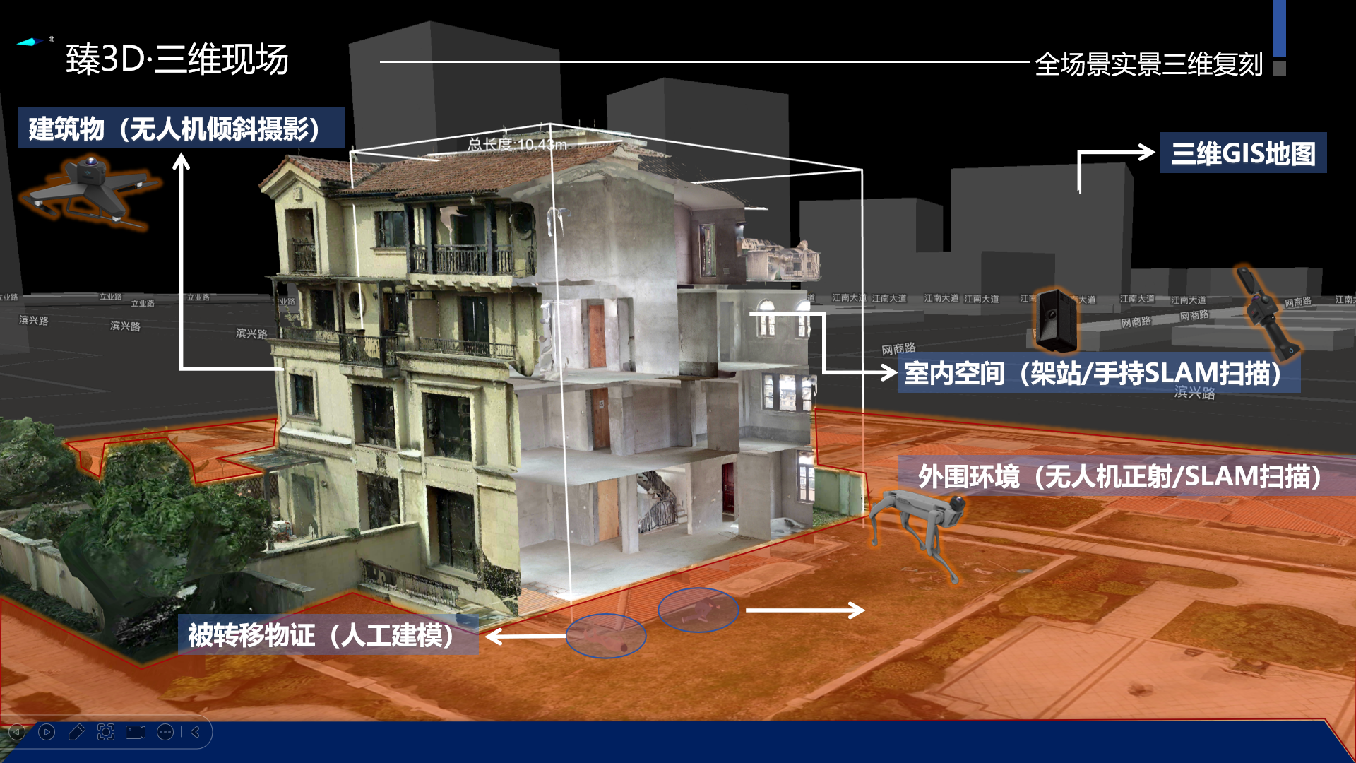“臻3D·实景三维火灾现场重建解决方案”是基于实景三维重建技术,赋能火灾调查自动化、数字化和智能化革新技术手段。实现快速、精准重建1:1真实现场,以三维形态呈现出火灾现场的痕迹、结构、布局等特征,客观真实地记录火灾现场的矢量数据;并结合数字复原技术,再现火灾现场原始形貌和推演火灾事故发生、发展及蔓延过程。为火灾原因调查、查明火灾事故责任提供有力的证据支撑。