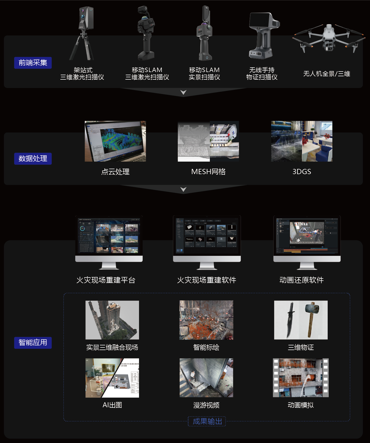 前端采集:配备适合不同使用场景的三维重建设备,安全、快速、方便地将现场准确地记录固定。